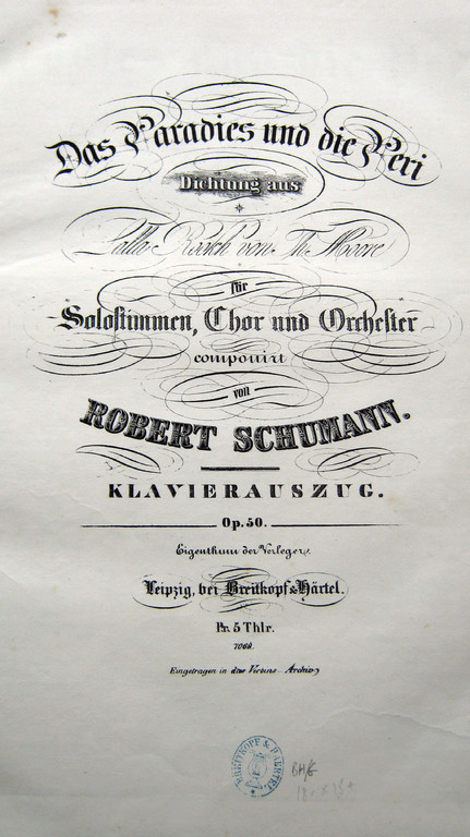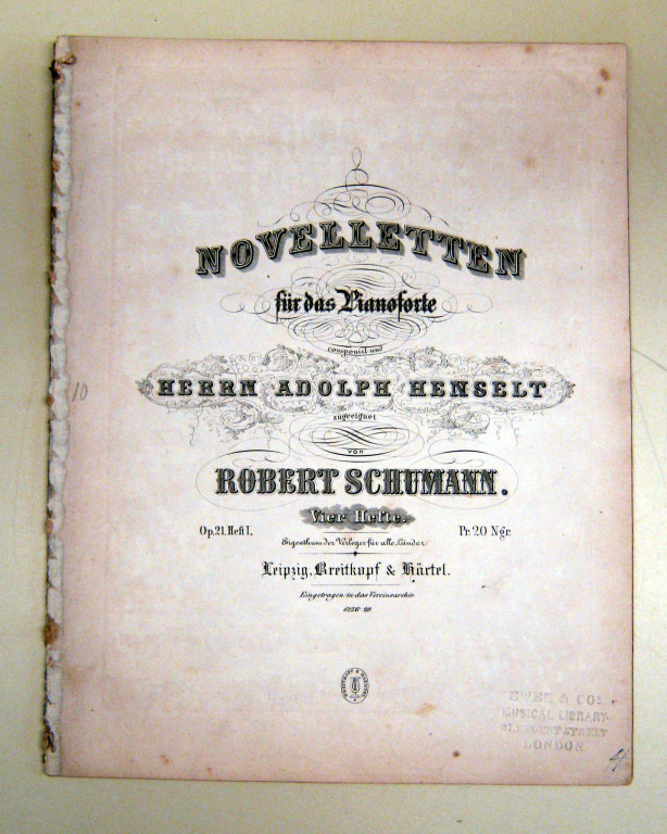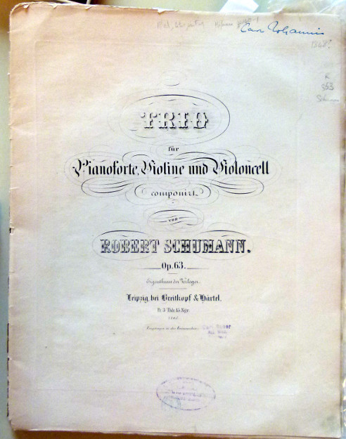 - Schumann, Robert: Trio op. 63 für Pianoforte, Violine und Violoncell / componiert von ROBERT SCHUMANN. – Klavierpartitur und Stimmen, Erstausgabe, späterer Druck. – Leipzig: Breitkopf & Härtel, [ca. 1848]. – Platten-Nr. 7785