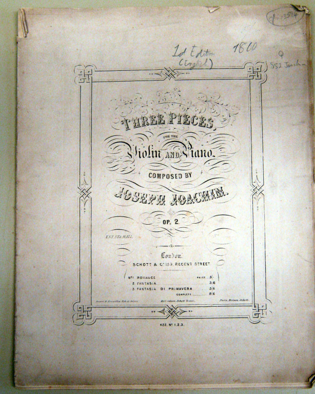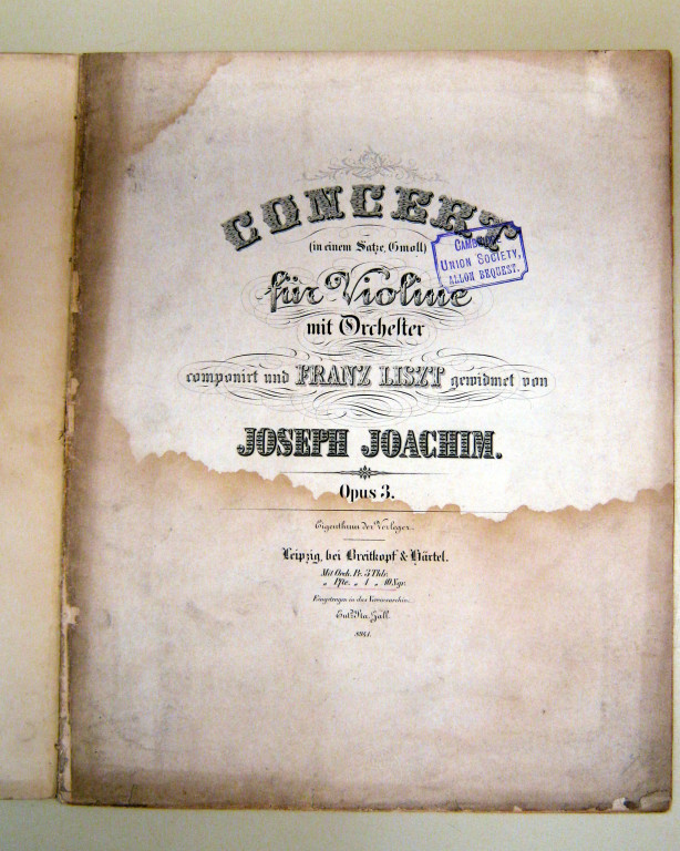 - Joachim, Joseph: Violinkonzert in einem Satz, g-Moll op. 3, Franz Liszt gewidmet.- Erstausgabe. – Leipzig: Breitkopf & Härtel, 1855? – Violinstimme und Klavierstimme. – Plattennummer 8941