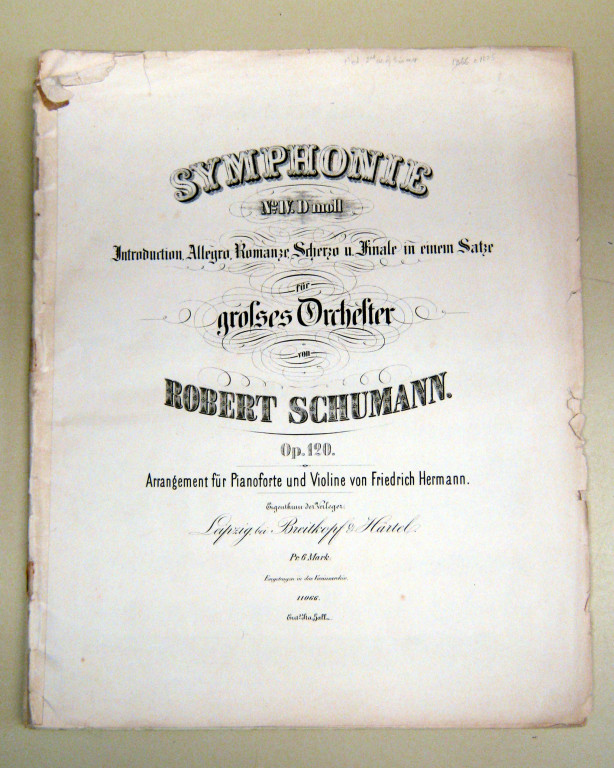 - Schumann, Robert: 4. Sinfonie op. 120 in der Bearbeitung für Violine und Klavier von Friedrich Hermann, Breitkopf & Härtel, 1875